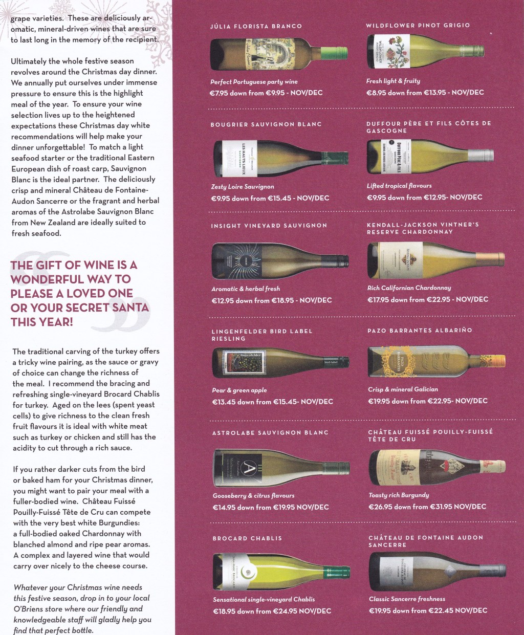 O’Briens have been bringing out a free booklet for a while now. No surprise that it’s called ‘O’Briens WINE’. Over the past year it has become more sophisticated and chock full of stories. It doesn’t treat its readers as if all they need to know are grape and price! The Christmas edition is fabulous. Everything from (wine) Essentials for Christmas, Christmas with our Winemakers and Unique Wines for a Unique Time of Year are discussed – In Easy to Understand DETAIL! Here’s a few from the mag: