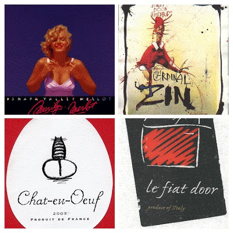 There was a time (short, I might add) that I collected strange, amusing and often weird, wine labels. The simplest are probably Marilyn Merlot, Cardinal Zin, Chat-eu-Oeuf or le fiat door! Mind you the Zin here is by the brilliant Ralph Steadman when he was designing for OddBins.